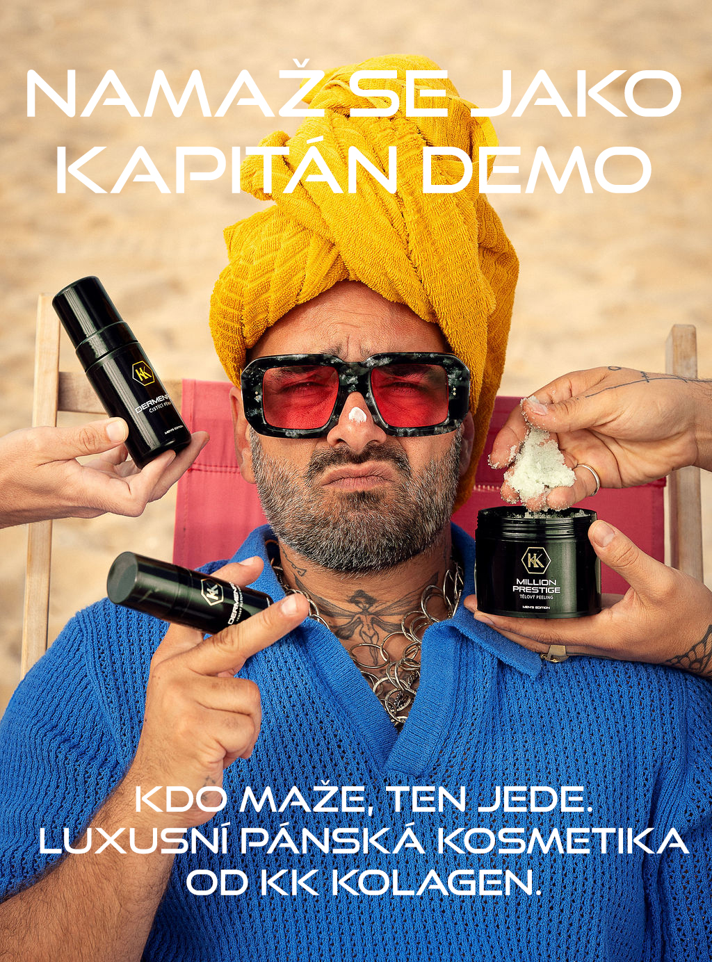 Co má na poličce Kapitán Demo? Kapitán Demo ví, že největší gamechanger je mazat se. Protože kdo maže, ten jede. Ať jsi na Polynésii, v Praze nebo ve své koupelně – KK Kolagen je tvůj upgrade.