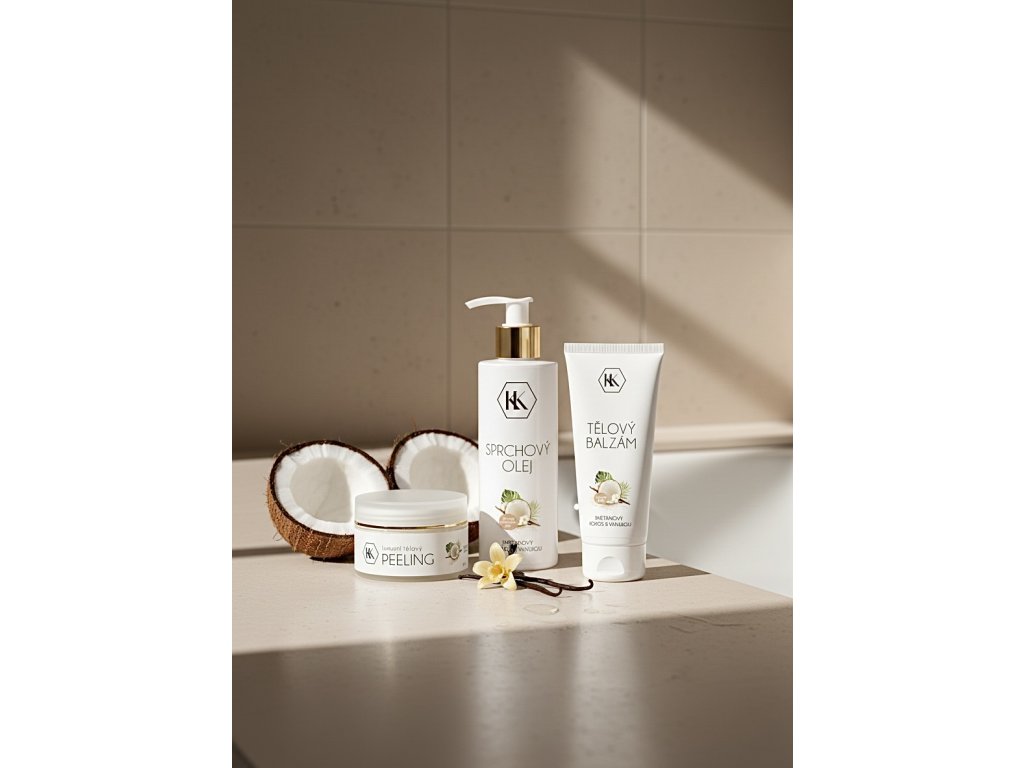 Smetanový kokos s vanilkou – luxusní tělová sada pro hydrataci a hebkou pokožku Luxusní dárková sada tělové péče s vůní kokosu a vanilky